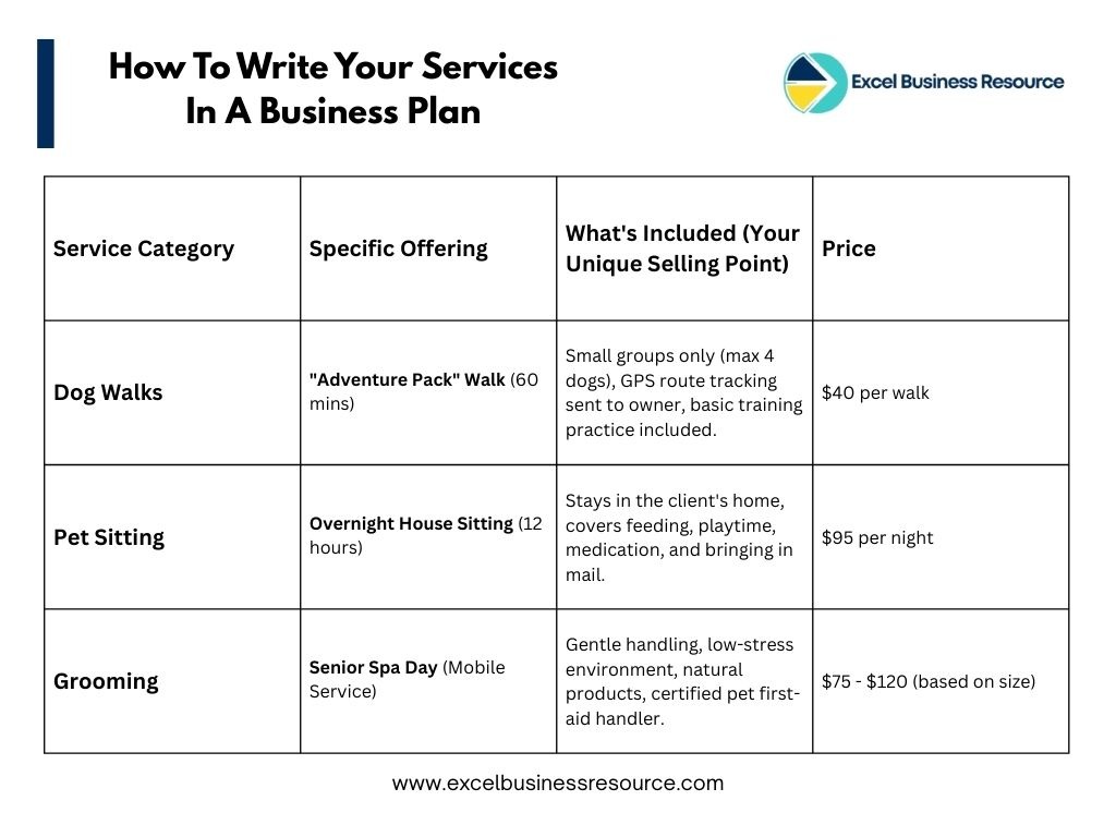 Don’t just say “dog walking.” Be specific about what makes your services special and how you price them, using this as a detailed pet care business plan sample for your offerings.