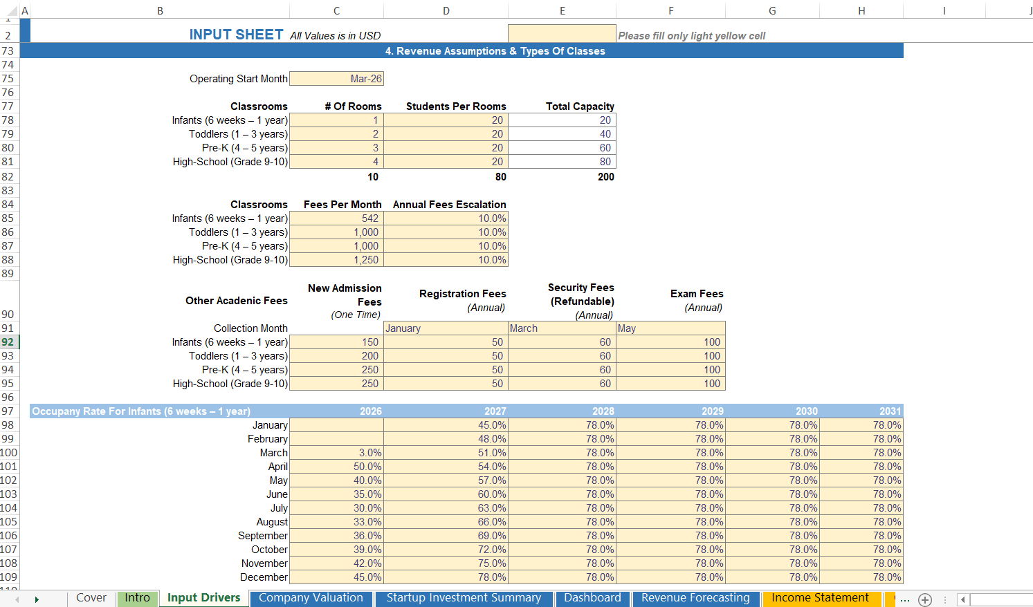 Fully editable Financial Model Template For Daycare Business in Excel, designed to provide a detailed and professional 5-year financial plan tailored for Daycare School Business. This pre-built model offers extensive features to streamline financial forecasting, investment analysis, and strategic planning.