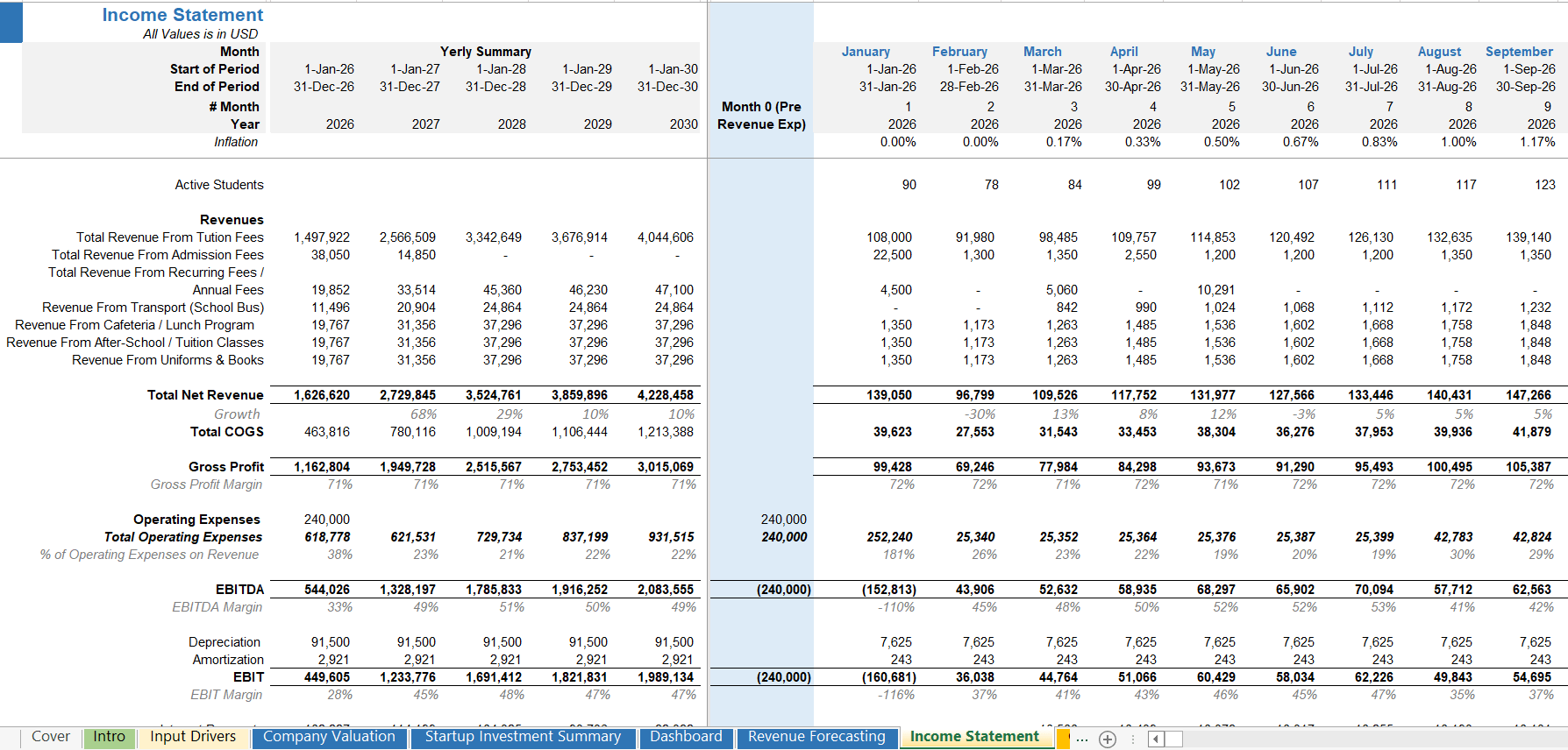 - Income Statement with monthly and yearly views showing revenue, cost of services, operating expenses, EBITDA, and net profit