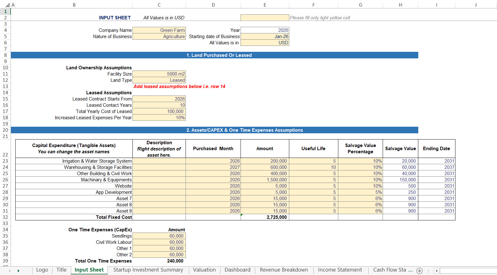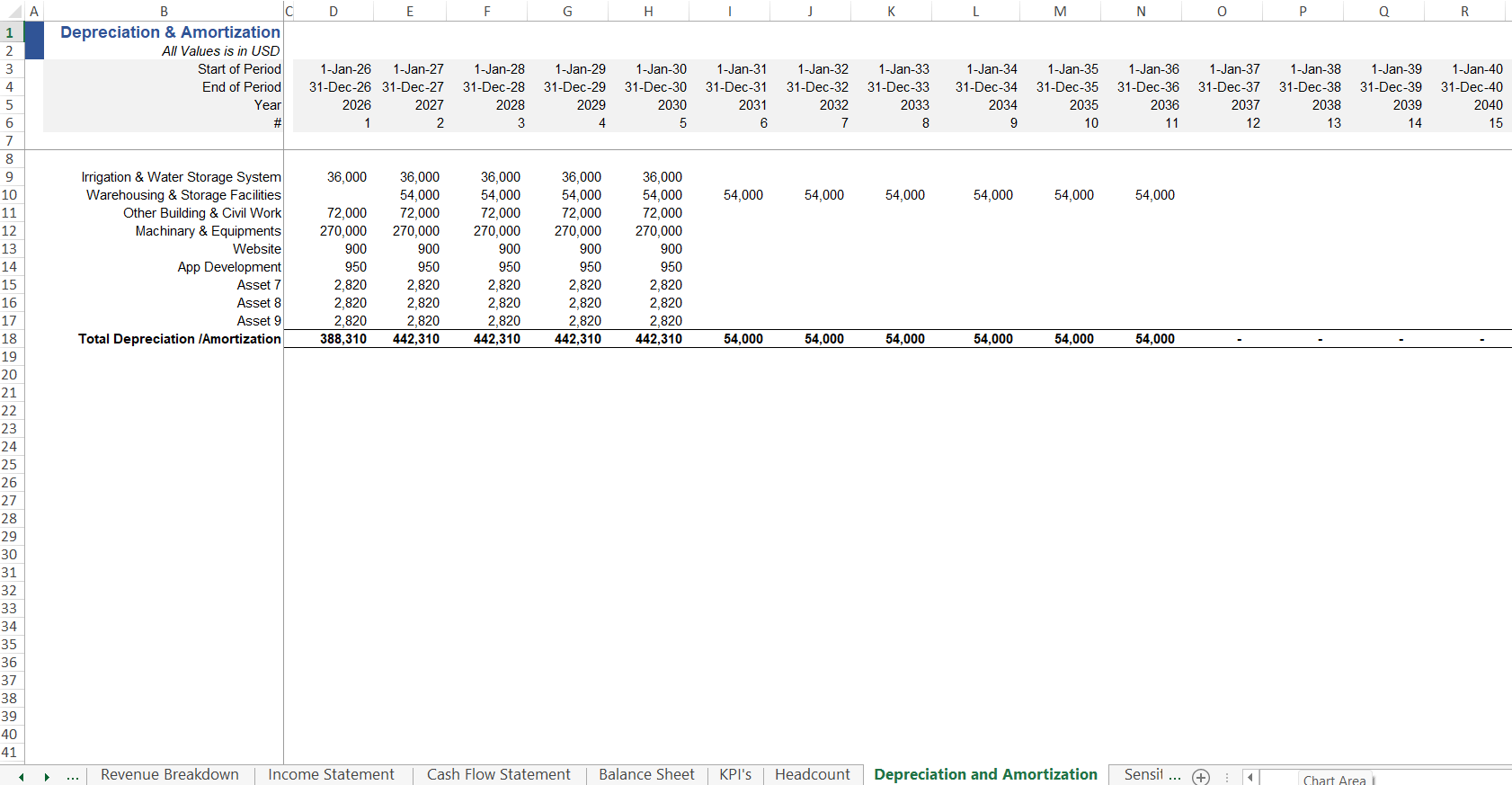 - 15+ fixed asset categories (Irrigation System, LED Lighting, HVAC, Racking, Automation, Warehousing, etc.)