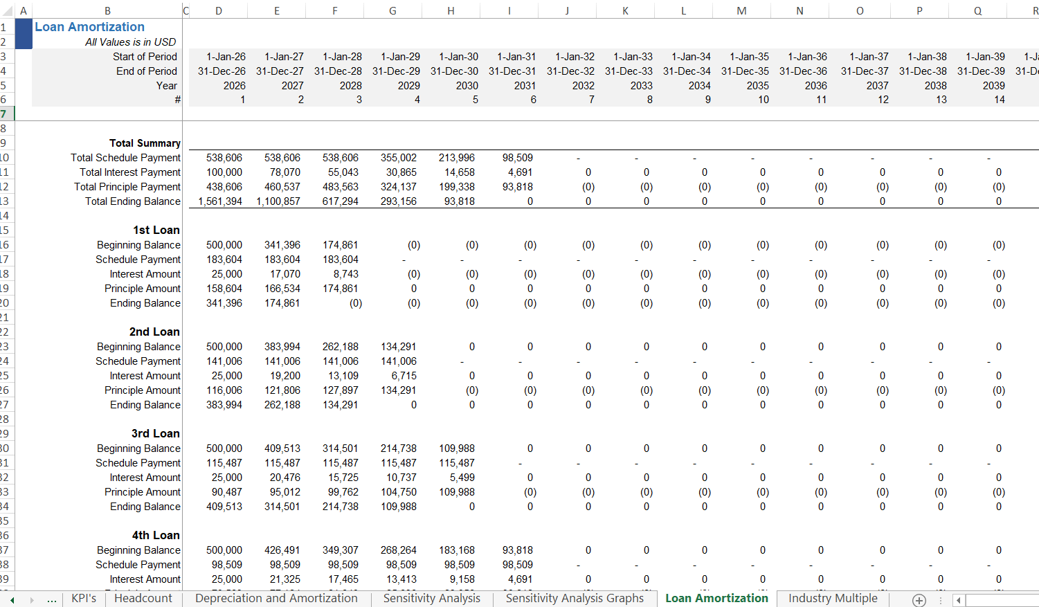 - Loan Amortization Schedule (supports multiple debt facilities)