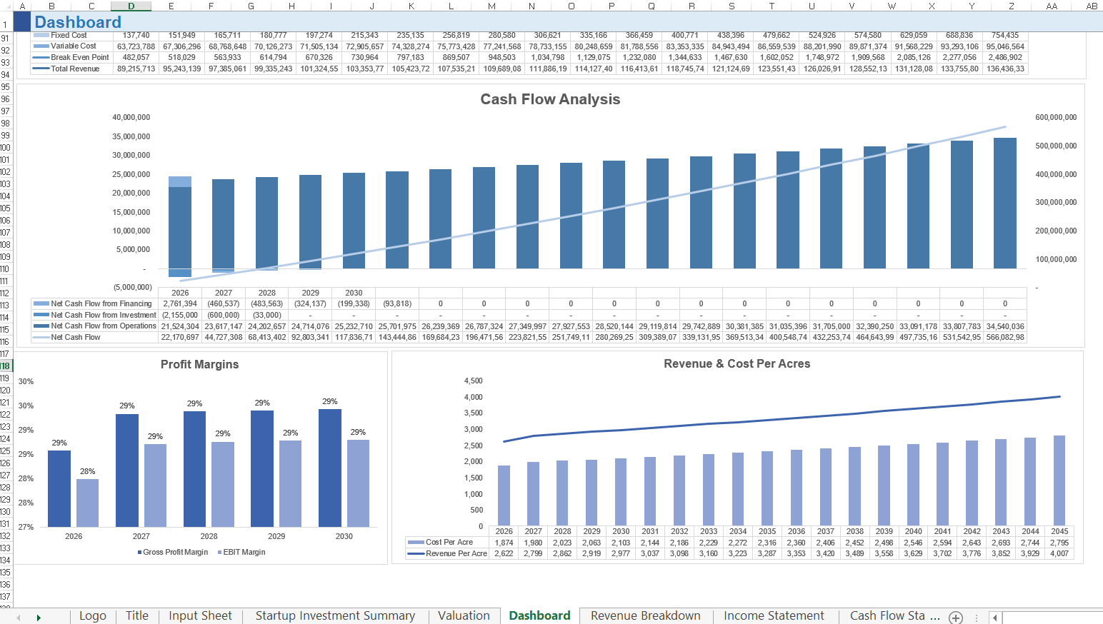 - Executive Dashboard with charts and KPIs: Revenue by Crop, Gross Margin %, EBITDA, Cash Balance, ROI, IRR, Payback Period