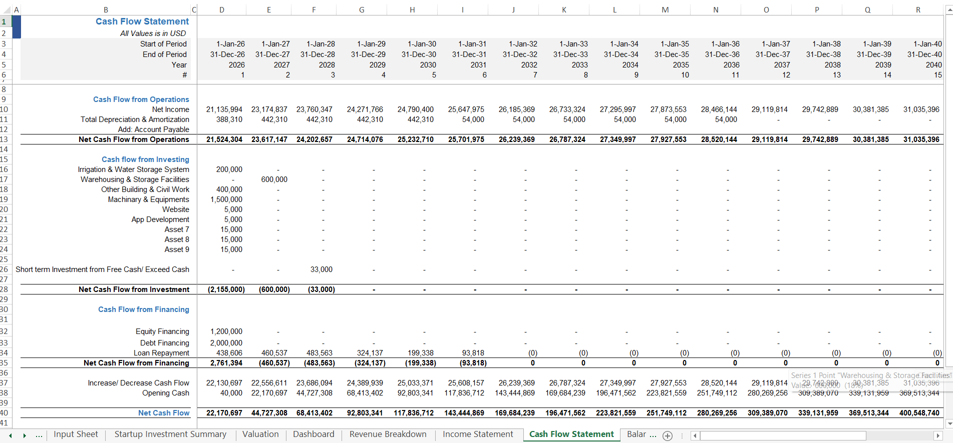 Whether you’re launching a hydroponic leafy greens farm, high-tech vertical tower system, container farm, or urban rooftop CEA project, this model handles complex revenue streams (multiple crops grown in stacked layers), high CAPEX, phased facility build-out, debt/equity funding mix, and detailed crop allocation by square meter.