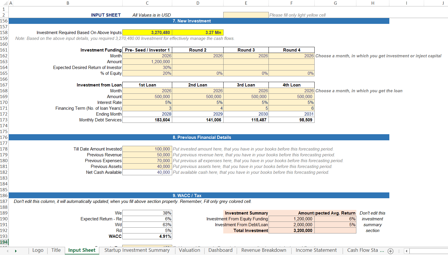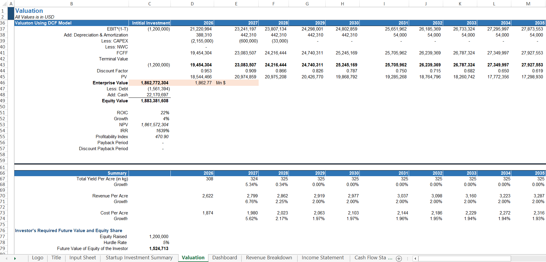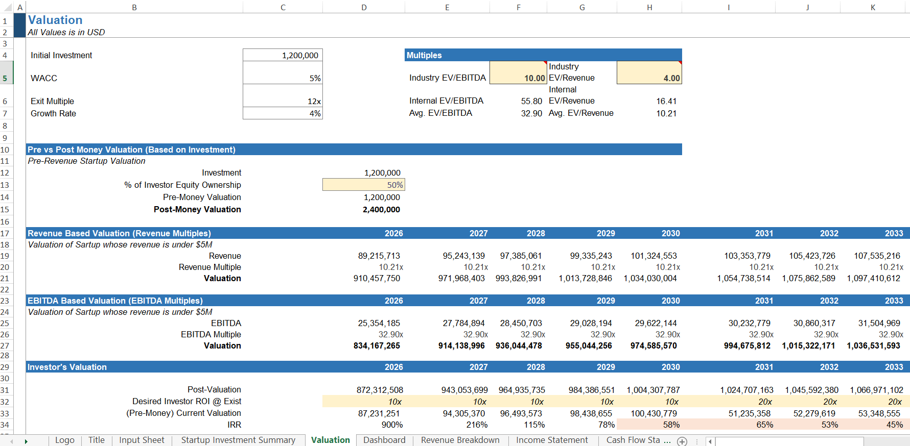 - Detailed Valuation i.e. DCF Valuation, EBITDA & Revenue Multiple Valuation, Investor Valuation, Pre & Post Money Valuation.