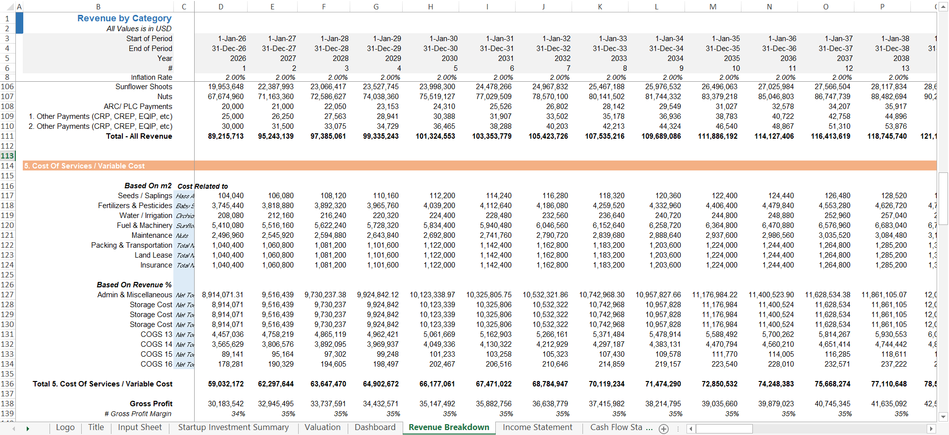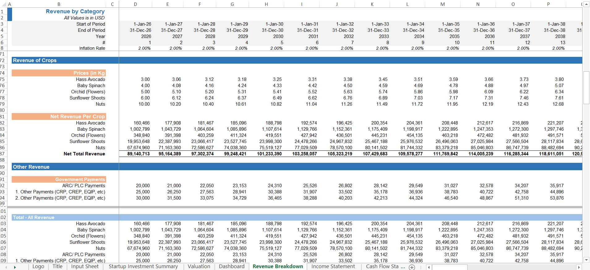 Fully editable Orchard / Crop Farming Financial Model Template in Excel, designed to provide a detailed and professional 20-year financial plan tailored for orchard & crop farm startups. This pre-built model offers extensive features to streamline financial forecasting, investment analysis, and strategic planning.